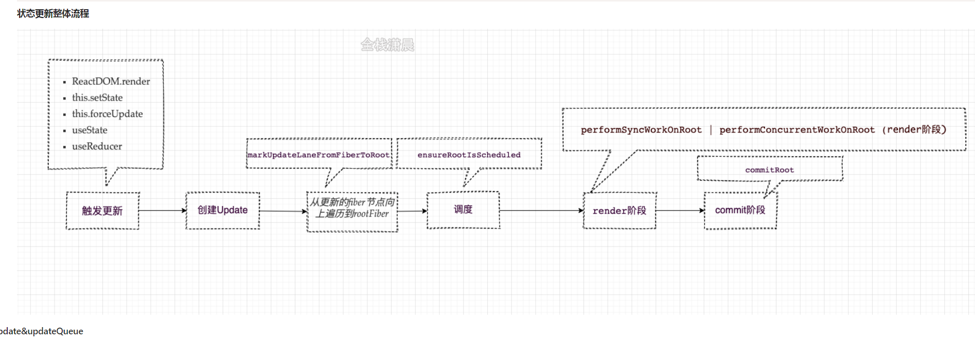 触发更新后,会在函数 createUpdate 中创建 update 更新,并将其加入到 updateQueue 中,会从触发更新的节点开始向上遍历到 rootFiber,遍历的过程会处理节点的优先级。然后根据优先级调度 render 阶段的入口函数。最后进行 render 阶段和 commit 阶段。
