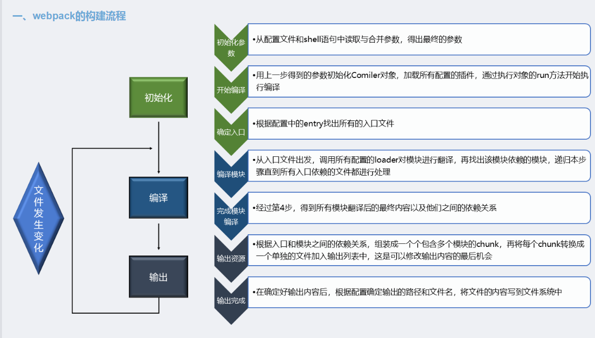 Shell语句中读取与合并参数,并初始化需要使用的插件和配置插件等执行环境所需要的参数 - 编译构建流程:从 Entry 发出,针对每个 Module 调用对应的 Loader 去翻译文件内容,再找到该 Module 依赖的 Module,递归地进行编译处理